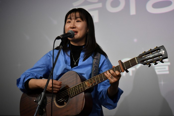 뜨거운 대담 후에는 지역에서 활동하는 싱어송라이터 유진솔의 축하 공연이 이어졌습니다. 대전, 골목, 사람들의 이야기를 음악에 담아내는 유진솔 님은 '나이테', '피란', '우리의하루' 세 곡을 선사하며, 우리가 지켜온 가치들과 연대하는 따뜻한 울림을 전해주었습니다.