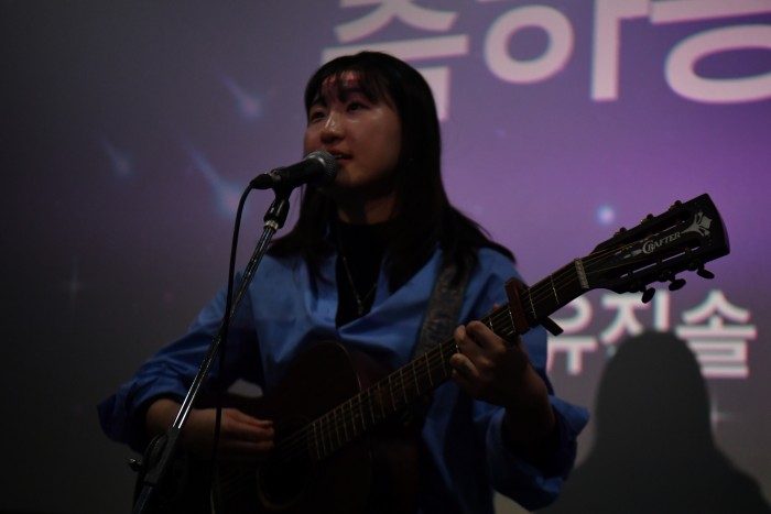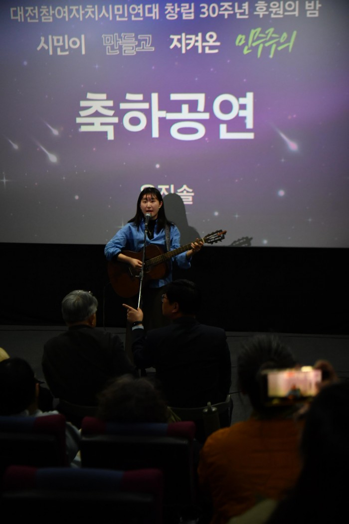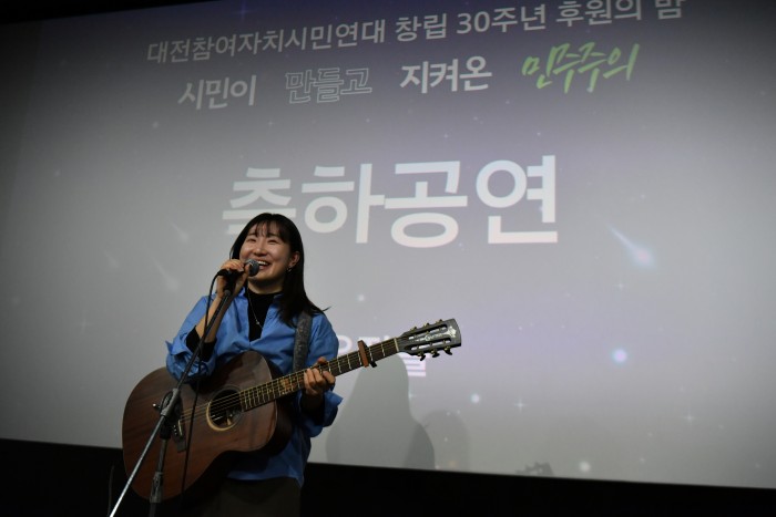 뜨거운 대담 후에는 지역에서 활동하는 싱어송라이터 유진솔의 축하 공연이 이어졌습니다. 대전, 골목, 사람들의 이야기를 음악에 담아내는 유진솔 님은 '나이테', '피란', '우리의하루' 세 곡을 선사하며, 우리가 지켜온 가치들과 연대하는 따뜻한 울림을 전해주었습니다.