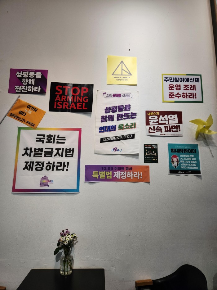 연대 상징: 현재 사무실에 비치되어 있던 여러 연대를 상징하는 피켓 및 현수막 (예: 차별금지법 제정하라, 성평등을 향해 가자 등)을 전시해, 우리 연대가 권력 감시를 넘어 다양성과 평등의 가치를 확장해 온 노력을 보여주었습니다.