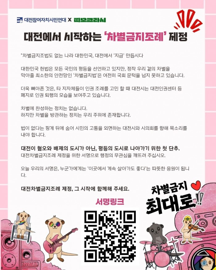 -시민 서명 운동: 혐오와 차별을 넘어, '대전 차별금지조례' 제정을 위한 서명 진행!